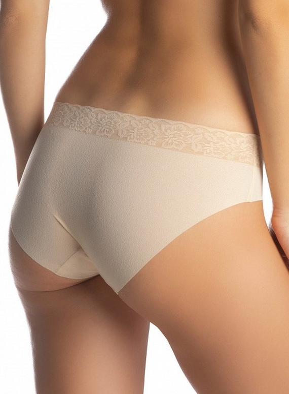 Figi damskie wykonane w technologi laserowej, nie odznaczają się pod ubraniem. W pasie ozdobna koronkowa guma. Pakowane w pudełko.